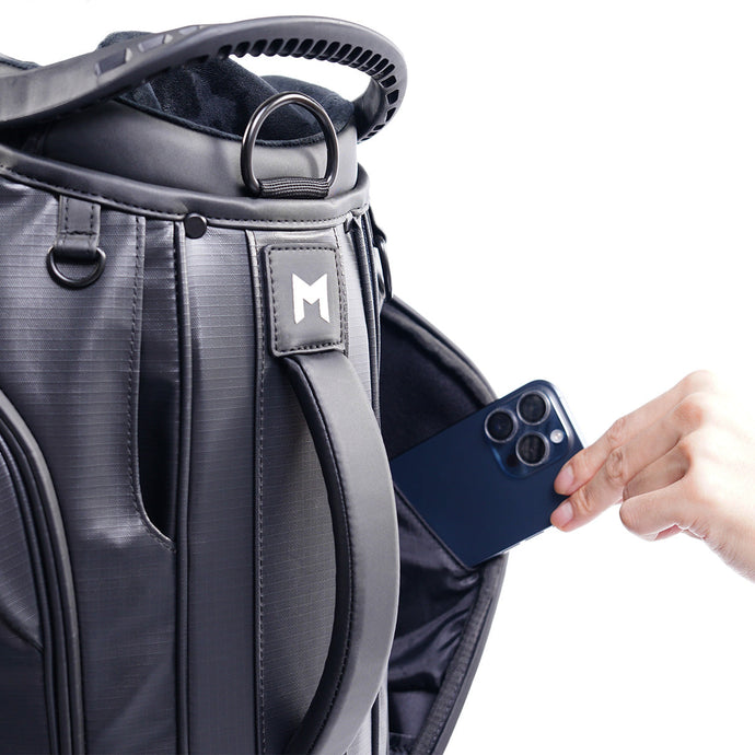 Designed for play, crafted for performance. Functional layout to complement your game. High performance materials and built to last. Split pockets on both sides with magnetic opening for easy access. Made with high performance recycled nylon fabrics. Unique styling for the passionate golfer.